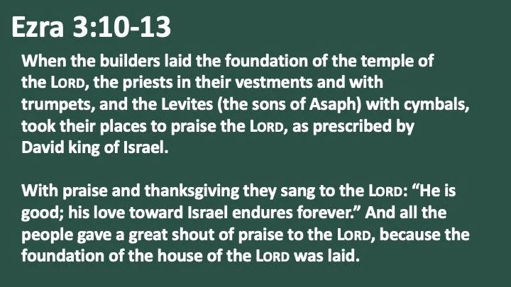 When the builders laid the foundation of the temple of the Lord, the priests in their vestments and with trumpets, and the Levites (the sons of Asaph) with cymbals, took their places to praise the Lord, as prescribed by David king of Israel. With praise and thanksgiving they sang to the Lord: “He is good; his love toward Israel endures forever.” And all the people gave a great shout of praise to the Lord, because the foundation of the house of the Lord was laid. But many of the older priests and Levites and family heads, who had seen the former temple, wept aloud when they saw the foundation of this temple being laid, while many others shouted for joy. No one could distinguish the sound of the shouts of joy from the sound of weeping, because the people made so much noise. And the sound was heard far away.