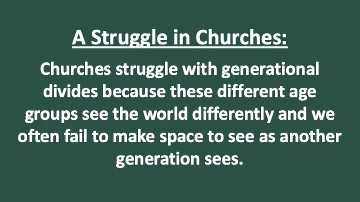 These two stories reveal a problem in many churches. Churches struggle with generational divides because these different age groups see the world differently and we often fail to make space to see as another generation sees.